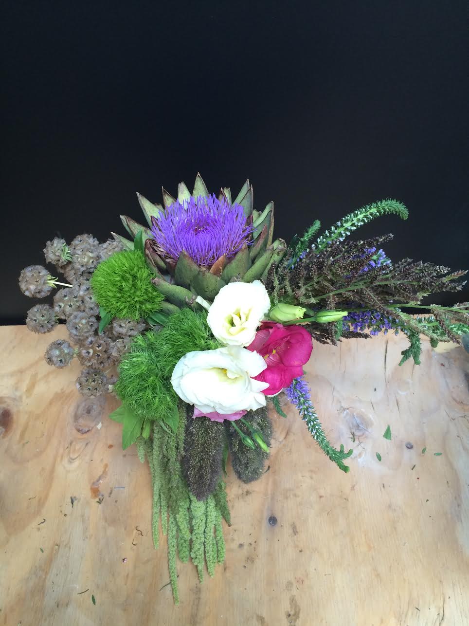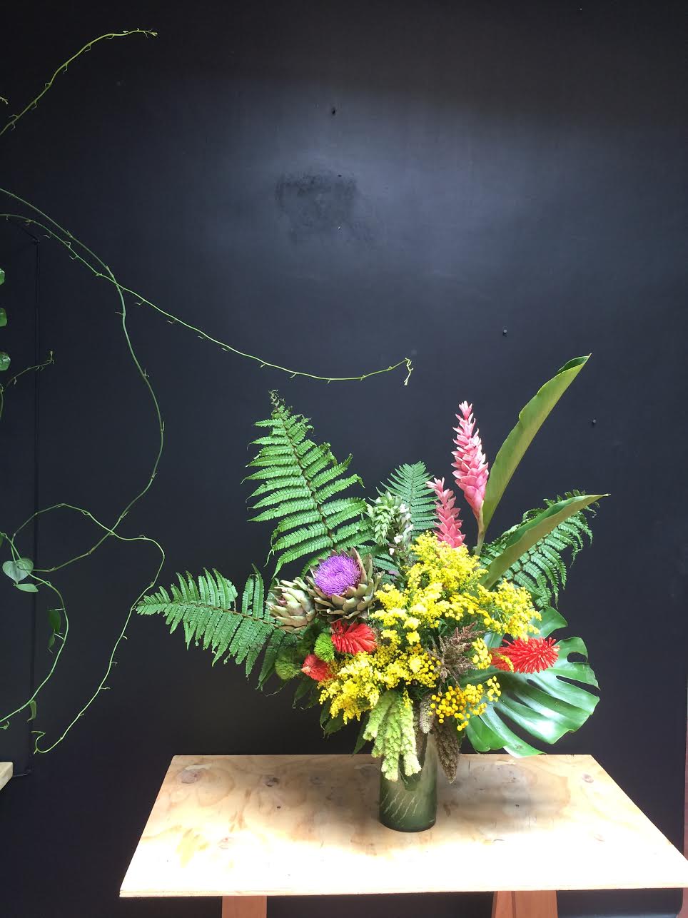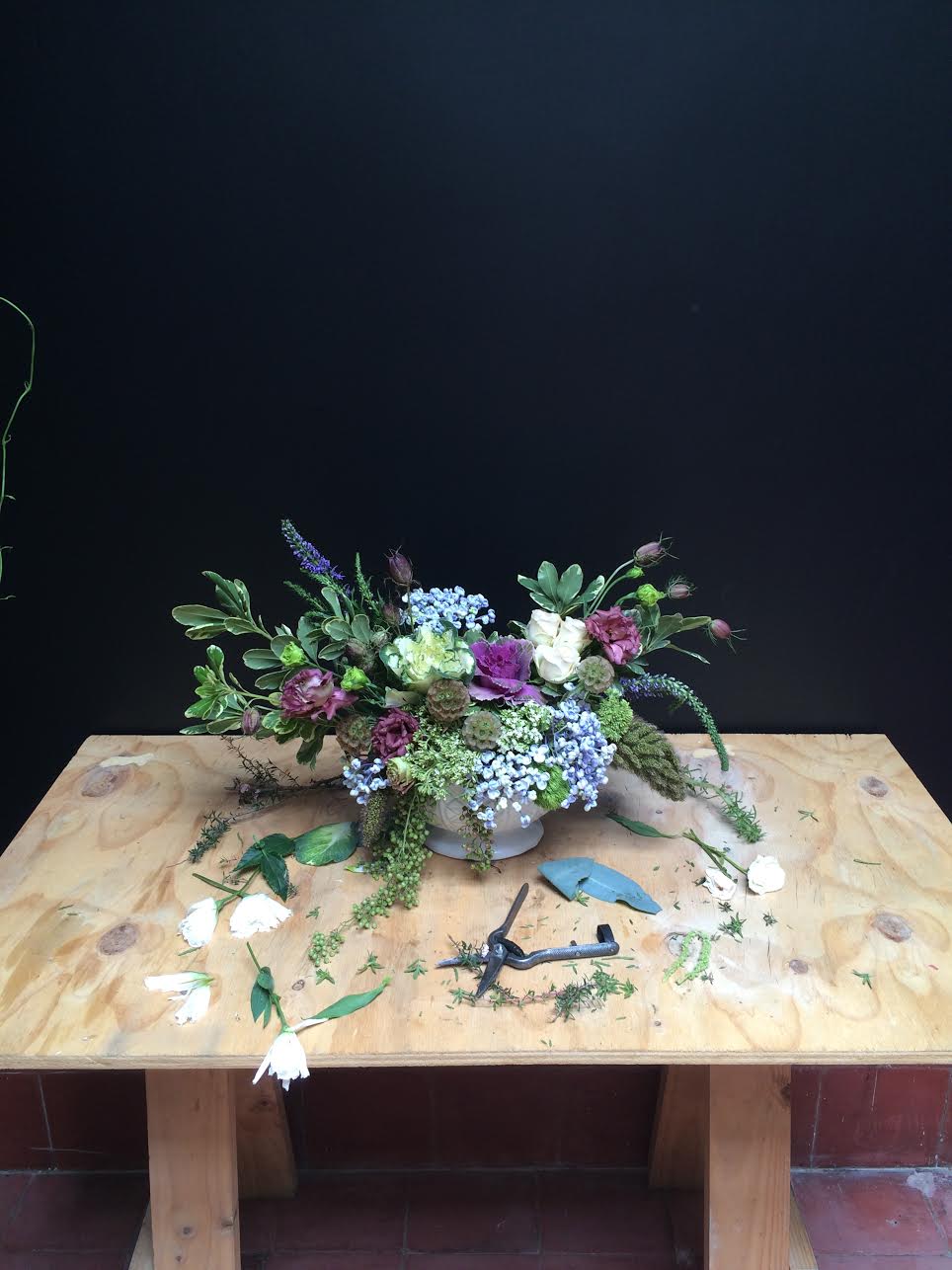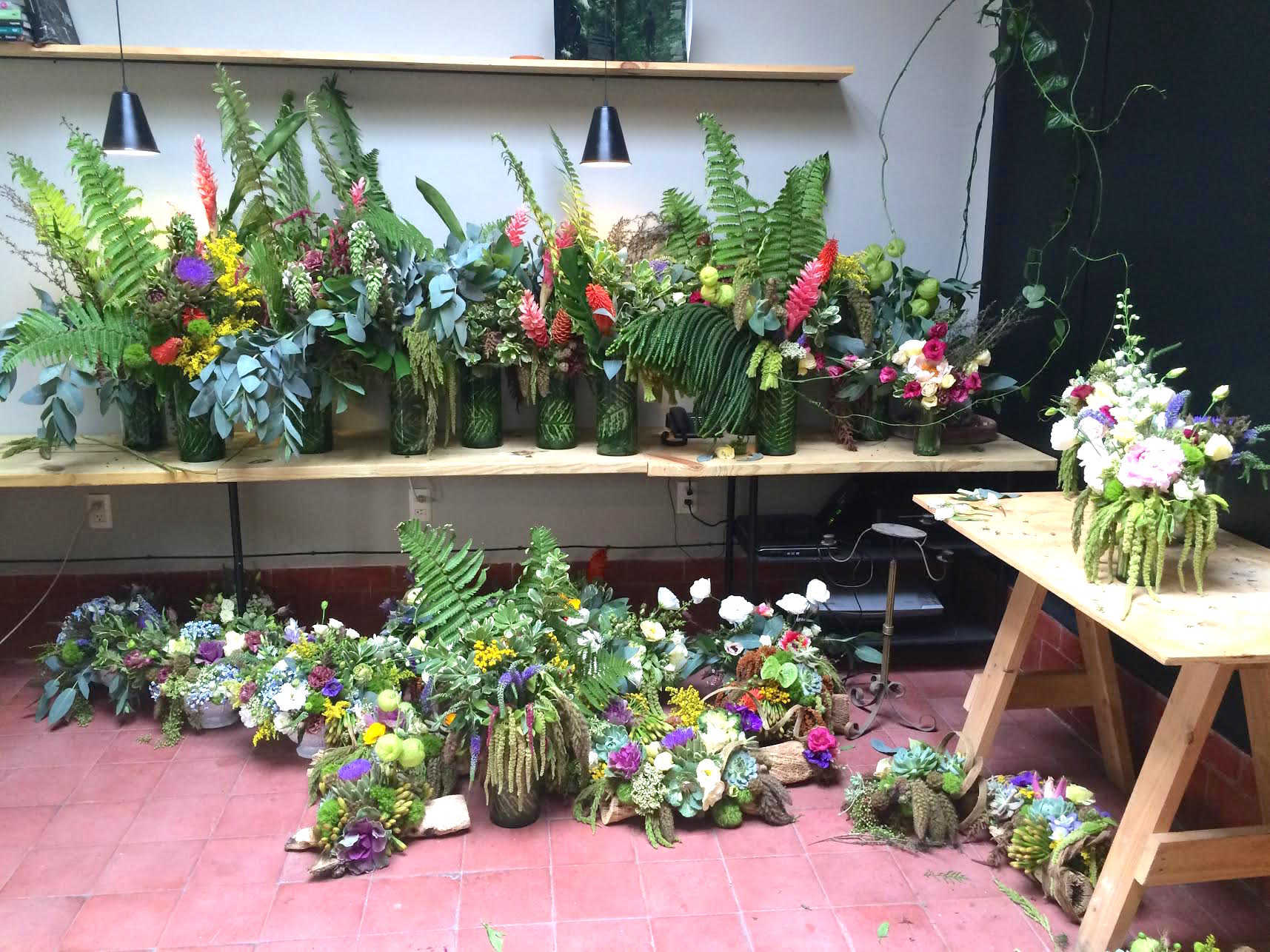 Olympia nos enseño todas sus técnicas para crear un arreglo alto, un tronco Allium (mi favorito), un centro de mesa y un ramo de novia. Ella compro cientos de flores diferentes, follaje, plantas, en fin, todo el material para que dejáramos volar la imaginación. El arreglo alto, tengo que confesar, fue el que me costo más trabajo pero al final hice algo escandaloso, grande, selvático, muy yo =) y me ayudo a sentir confianza para soltarme hasta sentirme a gusto alrededor de las flores.