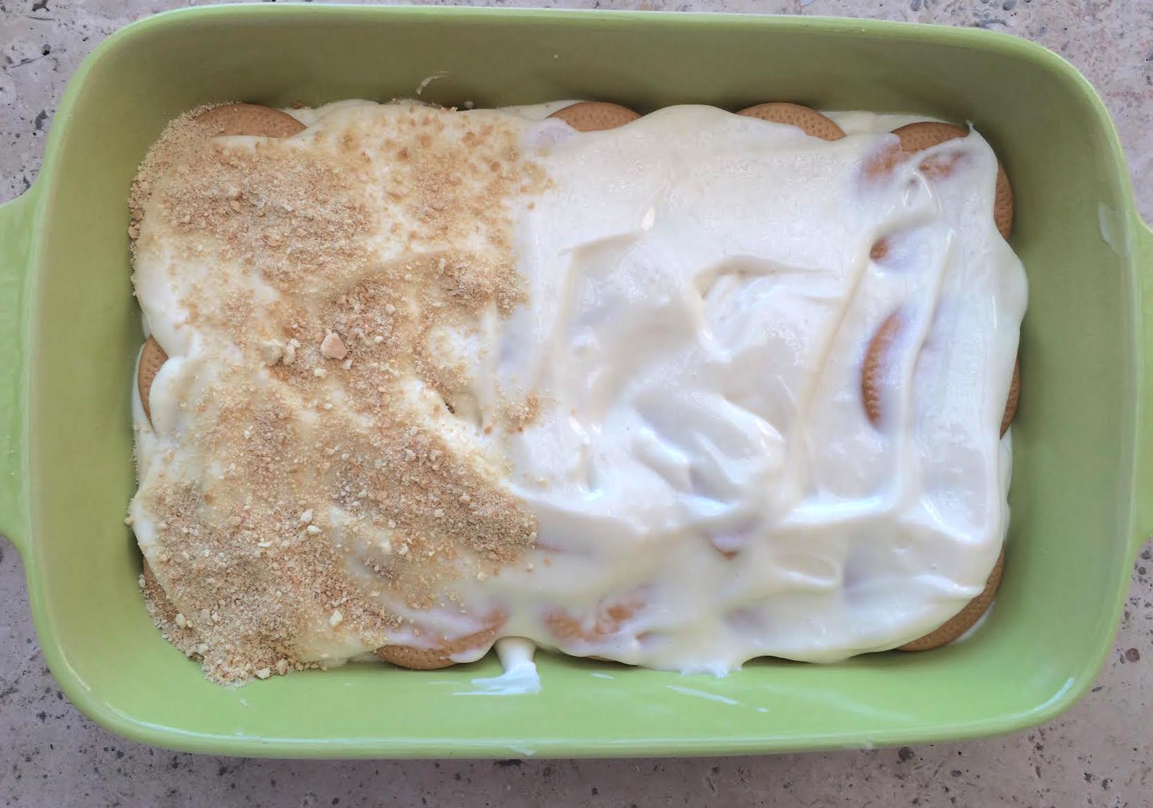En un refractario poner una capa de galletas Marías así enteras hasta rellenar todo el molde, luego poner un poco de la mezcla de la licuadora (fijarte que te alcance para hacer esto dos veces, no te acabes toda la mezcla a la primera). Luego poner otra capa de galletas, otra de la mezcla y al final poner encima la galleta María triturada que reservaste al principio. Meter al refri unas 3, 4 horas hasta que se enfrié bien. Servir.