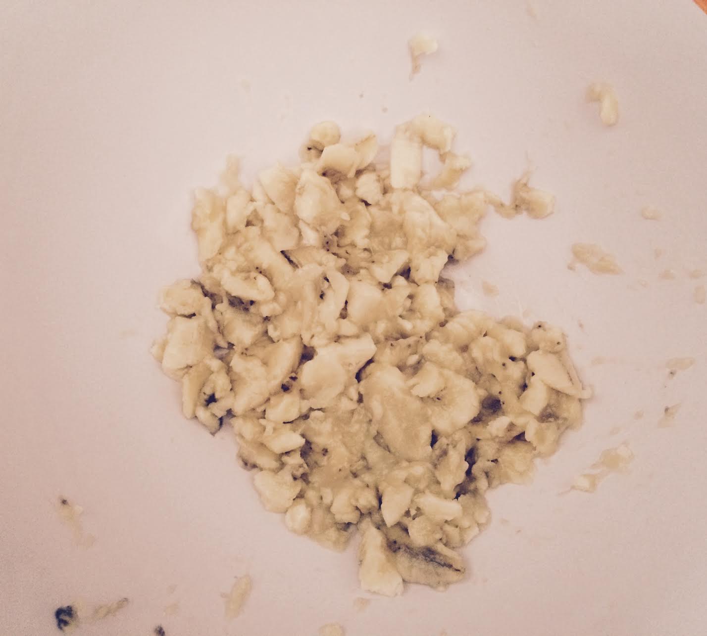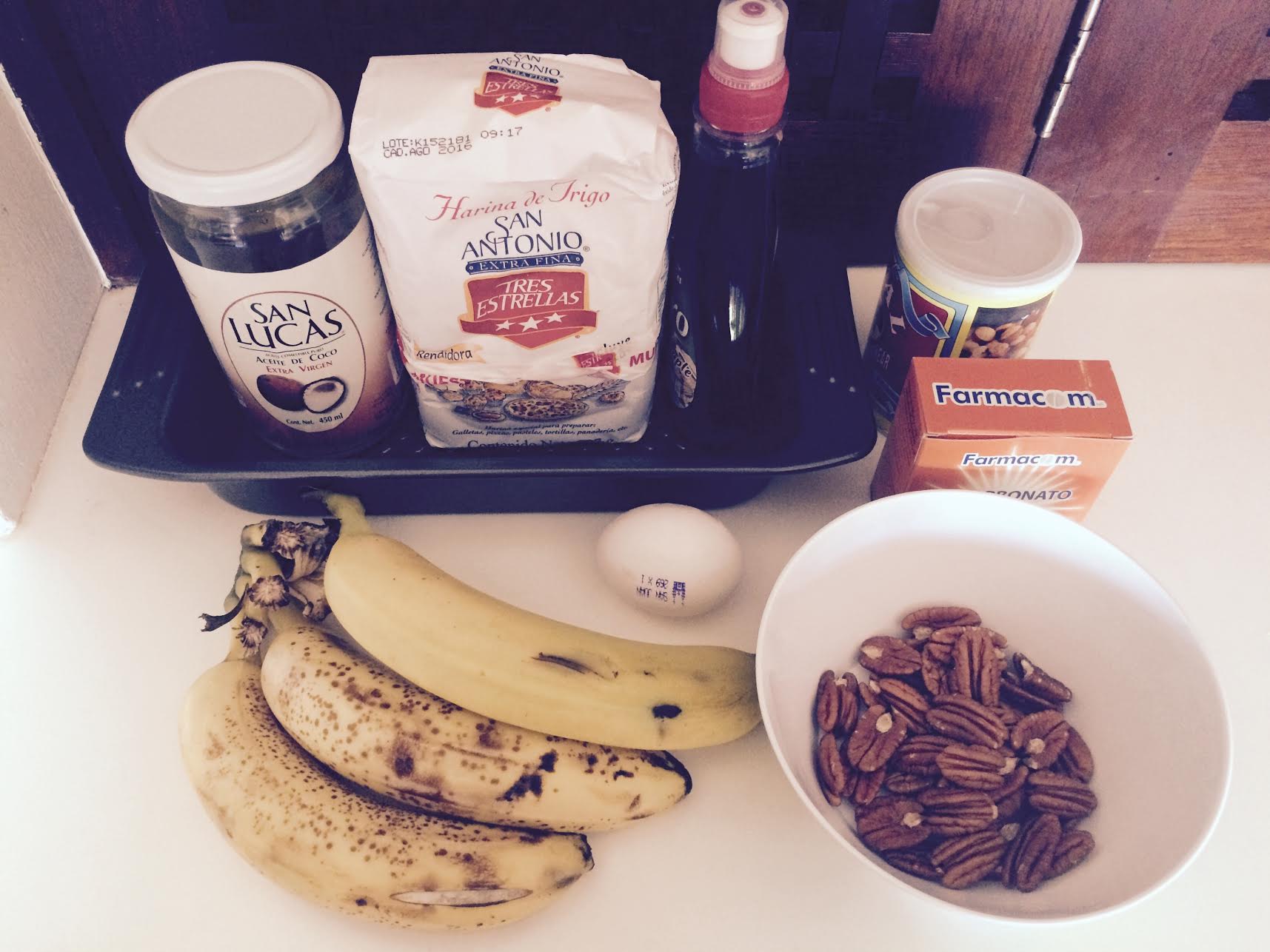 Ingredientes: 3 plátanos casi negros, 1 huevo, 1/3 tz aceite de coco, ½ tz miel de maple, 2 tz harina de trigo, ½ tz nueces picadas, ½ cdita de sal, 1 cdita de bicarbonato de sodio, 1cdita de polvo para hornear.
