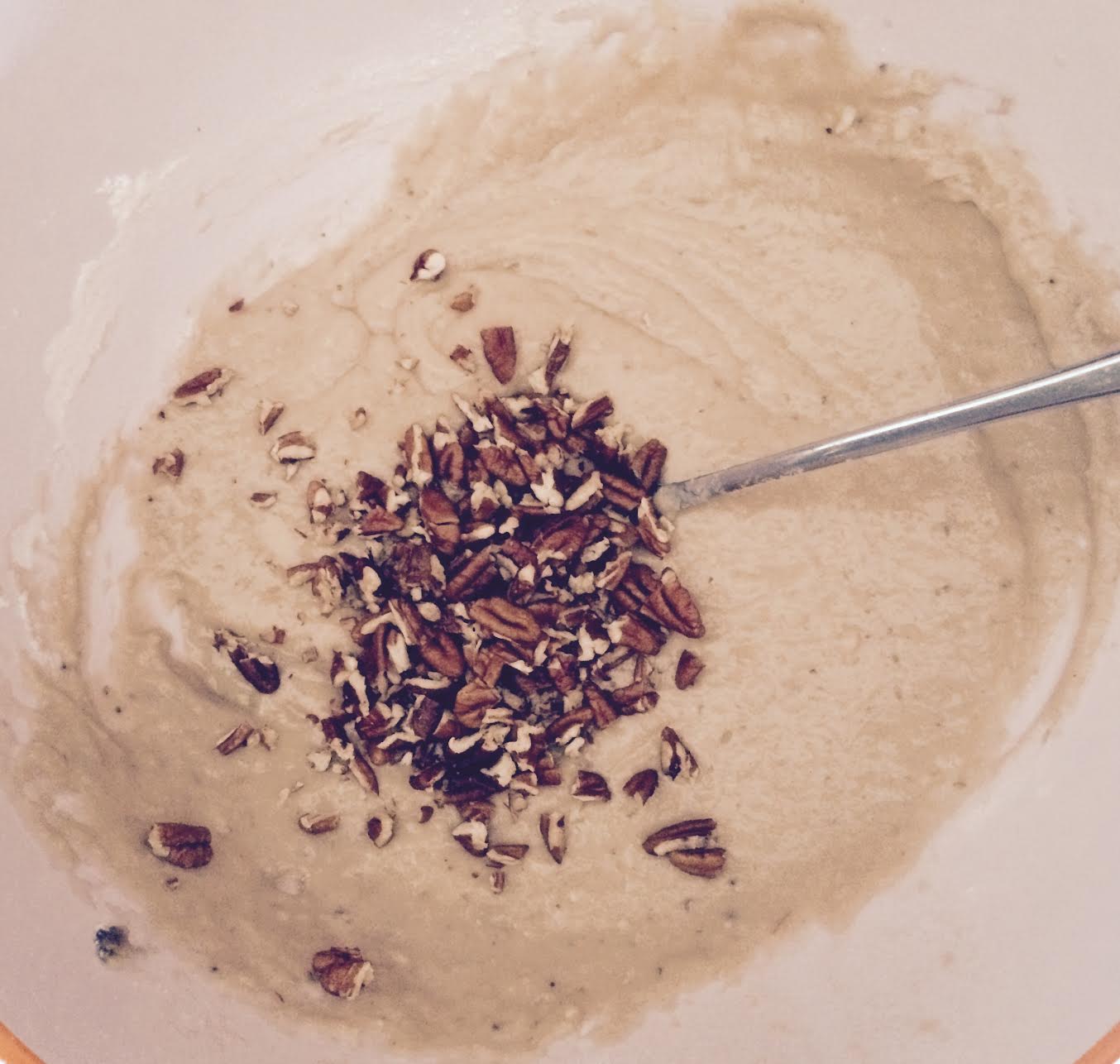 Ya que este bien mezclado agreguen la harina, sal, polvo para hornear, el bicarbonato y las nueces.