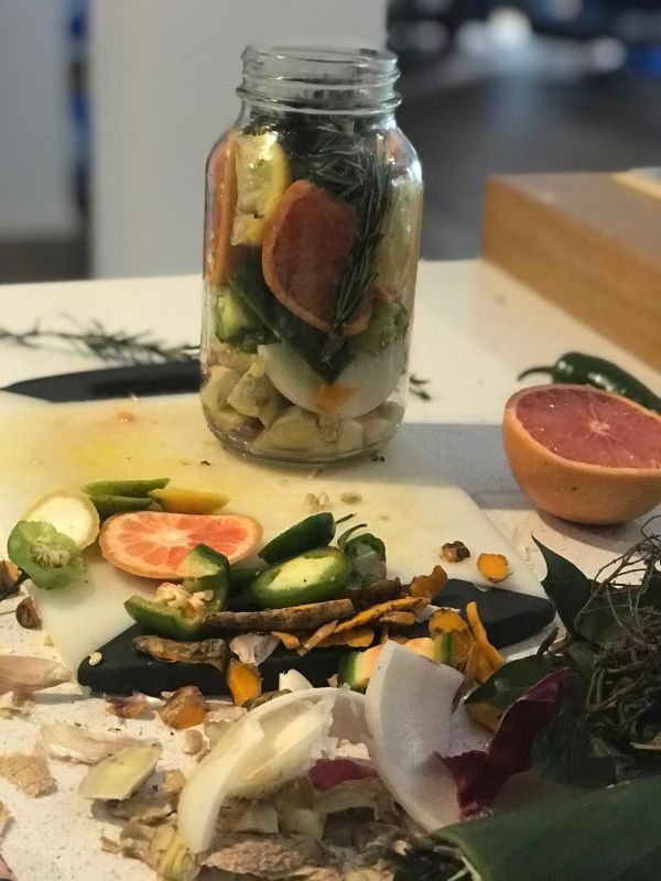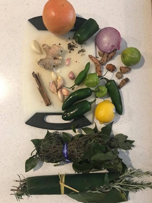 Ingredientes: 8 dientes de ajo, 1 cebolla, jengibre, chile (jalapeño, habanero, serrano), curcuma, tomillo, romero, toronja, naranja, limón y limón amarillo, vaina de canela, rábano, pimienta negra, 1 litro de vinagre de sidra de manzana orgánico (madre, no pasteurizado).